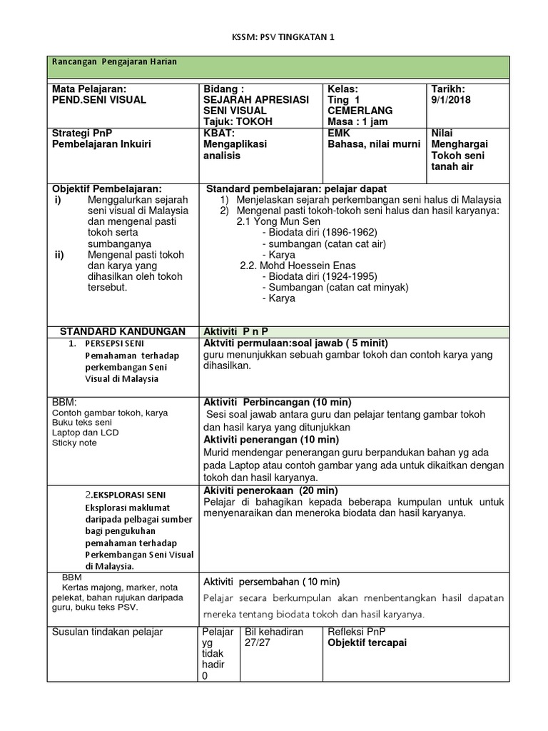 Rancangan Pengajaran Tahunan Pendidikan Seni Visual Tingkatan 2 KSSM 2018. Ia adalah mekanisme dalam mencapai. RPH Pendidikan Seni Visual Tahun 5 3.